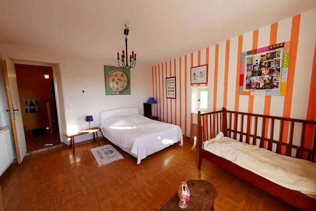 Features include a main living area with a fireplace, 5.5m high ceilings, also accessing a large terrace with a separate large kitchen room (62m2). The west wing offers spacious old stone floors living room and staircase to enter two bedrooms, one singled out with independent access and a bathroom.